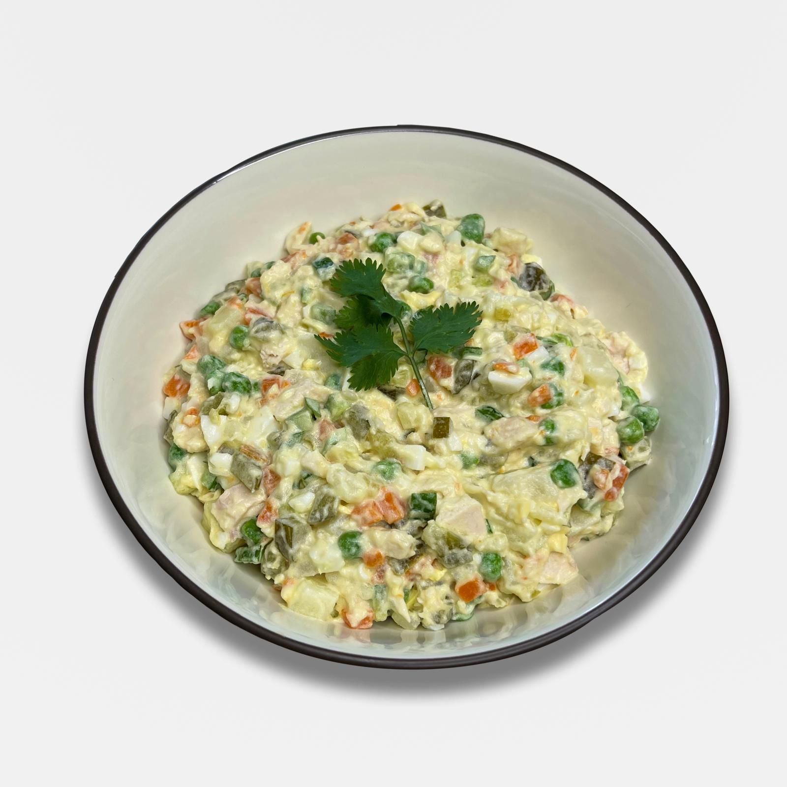 Olivie salad is a staple of Russian culinary tradition. No celebration can be imagined without Olivier salad. Originally created by a French chef Lucien Olivier at the end of the 19th century it gradually evolved in what it is now. It is mainly composed of potatoes, carrots, pickles, eggs, green peas all mixed with mayonnaise and its main component can be mortadella (doctorskaya sausage), chicken, beef or even beef tongue. Outside Russia it is commonly known as as a Russian salad. Presented salad was made with chicken breast with additional fresh cucumbers.